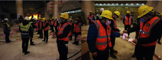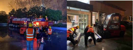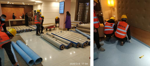 2月6日凌晨2點(diǎn)30分,第一車材料到達(dá)城市名人酒店,早已等候在現(xiàn)場(chǎng)的工人馬不停蹄開始卸貨、搬運(yùn)、裁減、鋪設(shè)施工,在疫情面前,市政人用團(tuán)結(jié)的精神、專業(yè)的技能、高效的協(xié)作,爭奪每一分每一秒。凌晨4點(diǎn),第二車材料到達(dá)共享國際酒店。