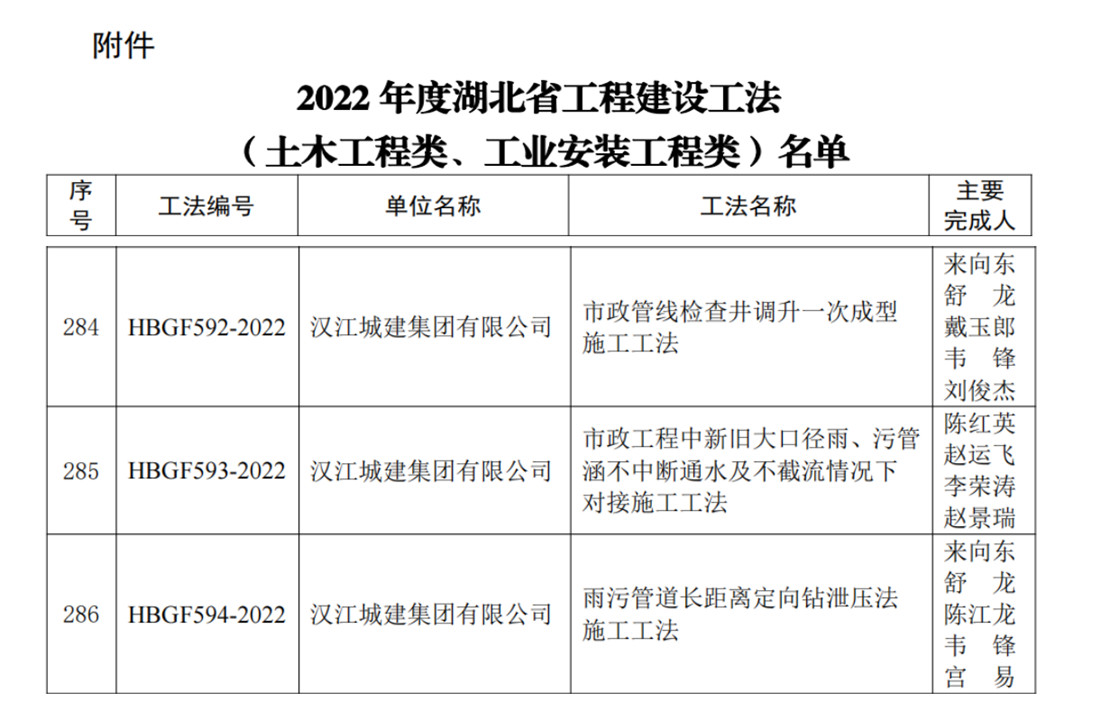 近日,湖北省住房和城鄉(xiāng)建設(shè)廳發(fā)布了《關(guān)于2022年度湖北省工程建設(shè)工法(土木工程類、工業(yè)安裝工程類)評審結(jié)果的公告》,對審定通過的331項(xiàng)湖北省工程建設(shè)工法進(jìn)行了公布,由漢江城建完成的《市政管線檢查井調(diào)升一次成型施工工法》《市政工程中新舊大口徑雨、污管涵不中斷通水及不截流情況下對接施工工法》《雨污管道長距離定向鉆泄壓法施工工法》三項(xiàng)工法獲評湖北省級工法。