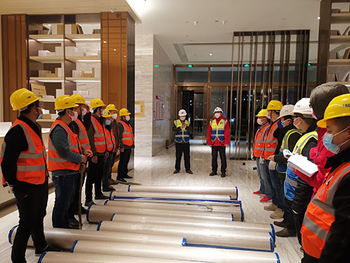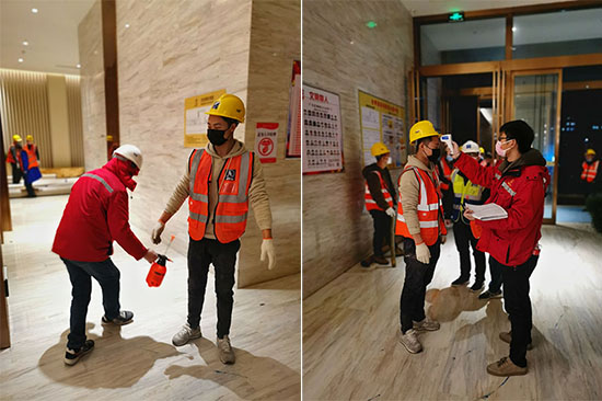 市政集團(tuán)領(lǐng)導(dǎo)在接到上級(jí)通知后,統(tǒng)籌安排,組織人力物力投入到三個(gè)酒店改造工程施工中。時(shí)間緊任務(wù)重,改建工作分為三個(gè)項(xiàng)目小組同步施工,其中全季酒店3、4、5樓三層樓共150個(gè)房間,市政集團(tuán)主要負(fù)責(zé)酒店走廊鋪裝改造,面積2000平米;城市快捷酒店3-13層樓共計(jì)11層樓202個(gè)房間,市政集團(tuán)主要負(fù)責(zé)走廊鋪裝改造,面積660平米;維也納酒店共計(jì)三層樓115個(gè)房間,面積3000平米;2月10日凌晨施工材料按照預(yù)定時(shí)間運(yùn)送到項(xiàng)目一線,各項(xiàng)目小組立即成立項(xiàng)目專(zhuān)班,管理人員分工協(xié)作,各司其責(zé),對(duì)施工人員進(jìn)行班前安全交底及施工技術(shù)交底,面對(duì)嚴(yán)峻的疫情,各項(xiàng)目小組嚴(yán)格貫徹落實(shí)集團(tuán)公司領(lǐng)導(dǎo)傳達(dá)的“重防護(hù),保安全”思想,安排專(zhuān)職管理人員對(duì)每位施工作業(yè)人員進(jìn)行信息登記、體溫監(jiān)測(cè)記錄,施工作業(yè)人員在體溫正常,無(wú)其他異常情況并完成消毒、正確佩戴口罩等安全防護(hù)工作后方可進(jìn)入施工現(xiàn)場(chǎng)。
