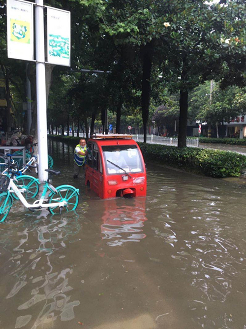 在觀察現(xiàn)場水患情況和市民扎堆擁堵現(xiàn)狀之后,市政集團二公司經理馮陽陽在現(xiàn)場快速定出三條措施應對。第一,在積水路口的四個方向安排專人指揮過往車輛提前掉頭繞行,避免司機涉水車輛被淹;第二,在人行道上安排專人將被水沖倒的共享單車收集歸整,清理出一條可供行人和非機動車臨時通行的便道,并引導其從淺水位置安全有序通行,既避免行人和非機動車交叉涉水的危險,又加快了通行效率;第三,在積水較深的十字路口集中力量幫扶需涉水過馬路的市民,特別是有小孩的時候,大家都主動抱起小孩涉水通行。