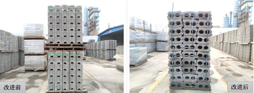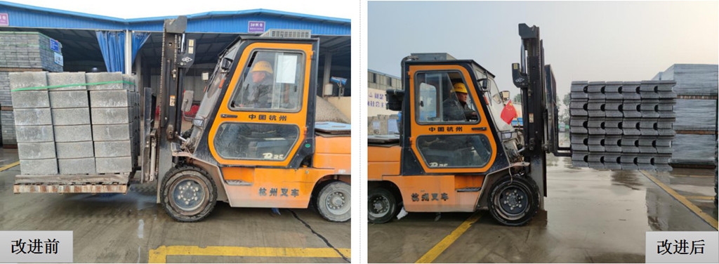 改進(jìn)措施的第一步是調(diào)整再生制品的碼垛方式,在原有碼垛的基礎(chǔ)上,利用再生制品本身的孔洞,交叉穿插綁扎鋼帶,起到穩(wěn)固、防止制品翻倒傾斜的作用。改進(jìn)的第二步是縮小叉車的貨叉尺寸,將原本120mm寬的貨叉,改為80mm寬,改進(jìn)后的貨叉在保證其原有功能的基礎(chǔ)上,能有效插入再生制品預(yù)留孔洞中,可直接利用叉車將打包好的檢查井模塊磚、水工磚等制品搬運到翻板機(jī)上進(jìn)行90度翻轉(zhuǎn),實現(xiàn)免托盤打包碼垛,隨后進(jìn)入成品堆放區(qū)進(jìn)行室外養(yǎng)護(hù)。經(jīng)過近半個月的工作實踐,這兩步小小的改動,成功適用于新材料公司生產(chǎn)的環(huán)保再生檢查井模塊磚和水工磚。
