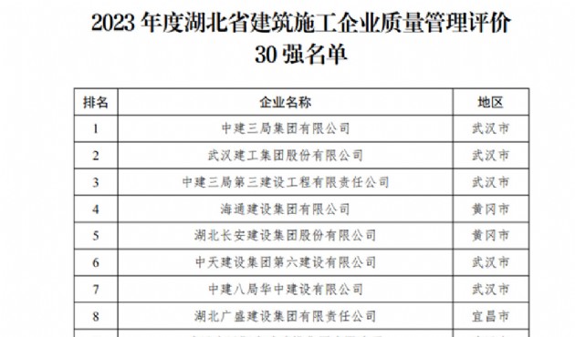 近日,湖北省建設(shè)工程質(zhì)量安全協(xié)會(huì)公布2023年度湖北省建筑施工企業(yè)質(zhì)量管理評價(jià)30強(qiáng),漢江城建集團(tuán)光榮入選,全市僅此2家企業(yè)上榜