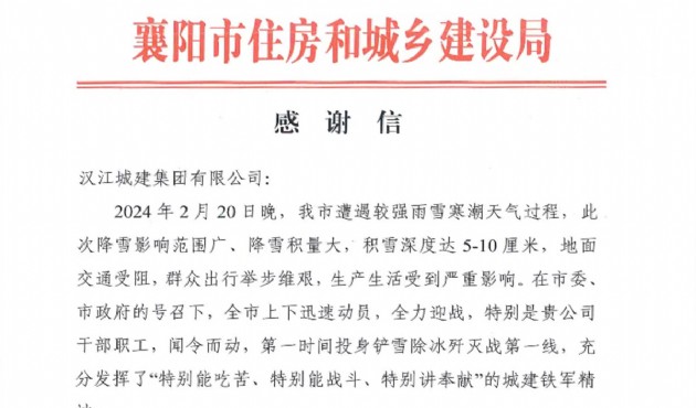 2月26日,襄陽市住房和城鄉(xiāng)建設(shè)局送來感謝信,對漢江城建集團(tuán)干部職工聞令而動(dòng),第一時(shí)間投身鏟冰除雪殲滅戰(zhàn)第一線的奉獻(xiàn)精神表示