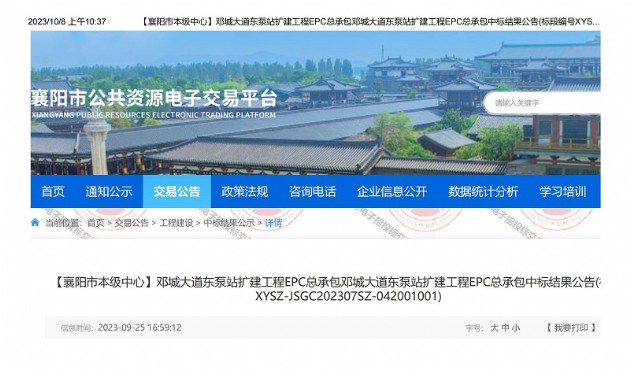 9月25日,漢江城建集團有限公司牽頭中標鄧城大道東泵站擴建工程EPC總承包項目(以下稱“本項目”),中標金額15380.32
