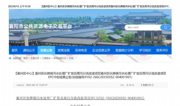 2023年6月15日,漢江城建集團有限公司牽頭中標襄州區(qū)伙牌鎮(zhèn)污水處理廠擴容及雨污分流改造項目EPC(以下稱“本項目”)