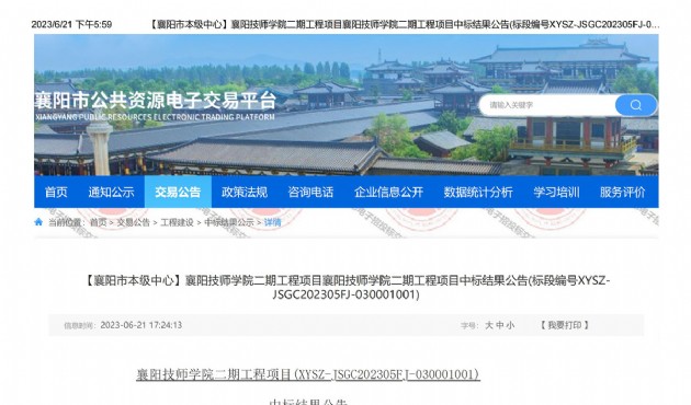 6月21日,漢江城建集團有限公司牽頭中標襄陽技師學院二期工程項目(以下稱“本項目”),中標金額62825.81萬元,建設工
