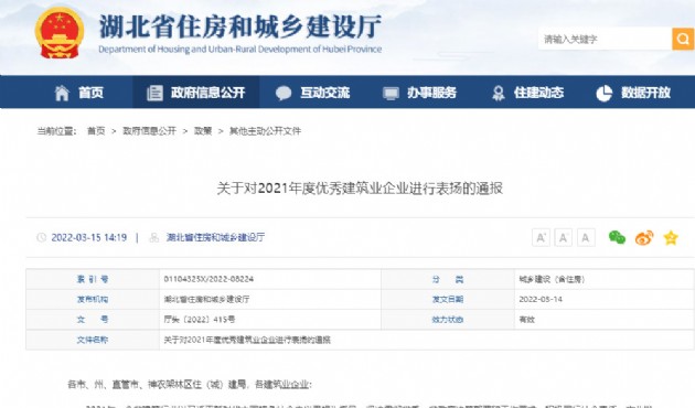 為充分發(fā)揮優(yōu)秀建筑業(yè)企業(yè)在湖北省建筑行業(yè)的典型示范引領(lǐng)作用,3月14日,湖北省住房和城鄉(xiāng)建設(shè)廳公布2021年度湖北省優(yōu)秀建筑業(yè)企
