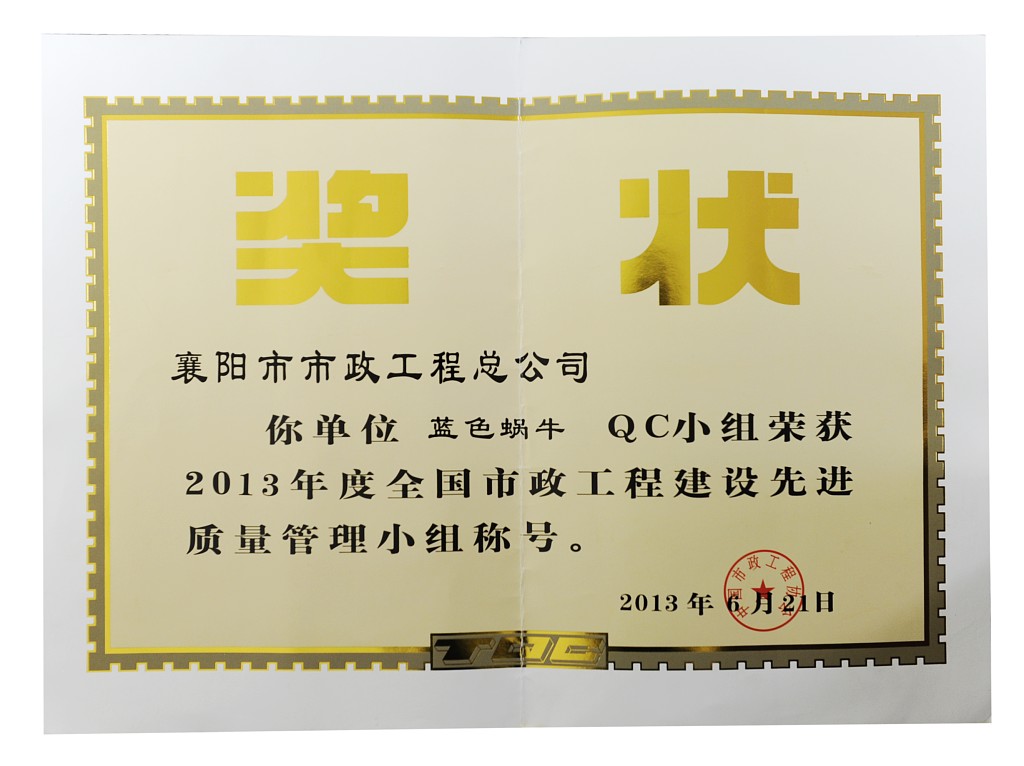 2013全國(guó)市政先進(jìn)質(zhì)量管理小組稱號(hào)