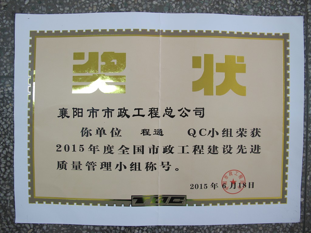 2015全國(guó)市政先進(jìn)質(zhì)量管理小組稱號(hào)