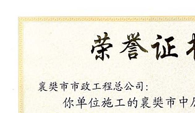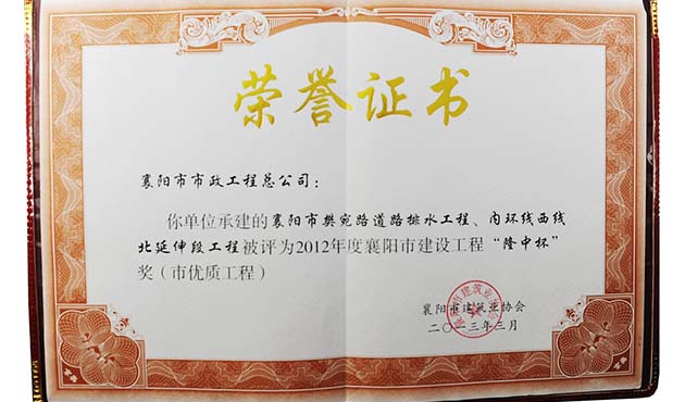 2012樊宛路工程襄陽市“隆中杯”證書