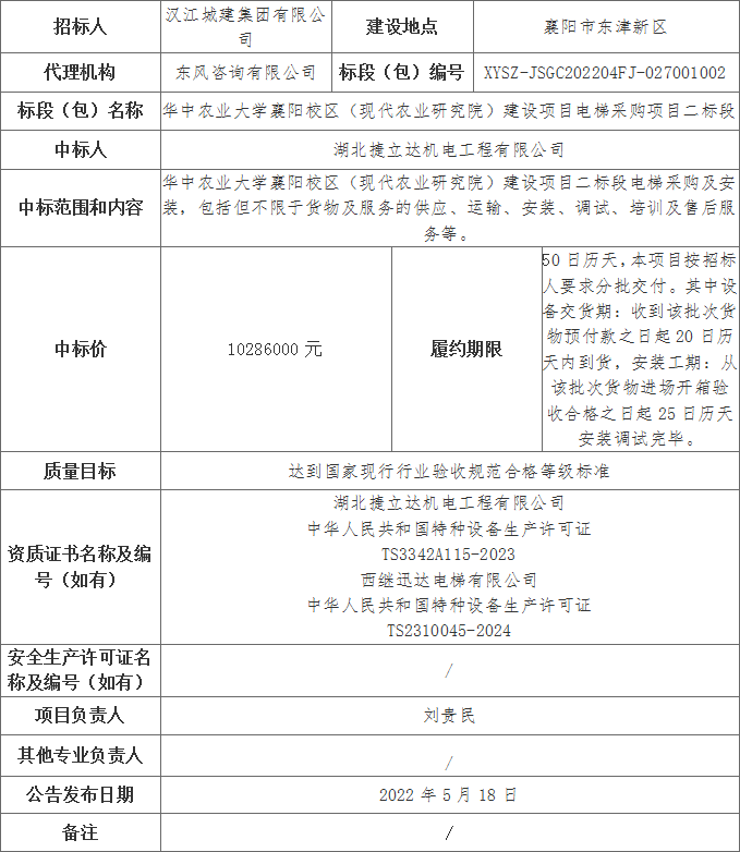 華中農(nóng)業(yè)大學(xué)襄陽(yáng)校區(qū)(現(xiàn)代農(nóng)業(yè)研究院)建設(shè)項(xiàng)目電梯采購(gòu)項(xiàng)目二標(biāo)段于2022年5月 10日在襄陽(yáng)市公共資源交易網(wǎng)、湖北省公共資源交易電子服務(wù)平臺(tái)、漢江城建集團(tuán)有限公司官網(wǎng)發(fā)布中標(biāo)候選人公示,公示期為2022年5月10日至2022年5月12日(北京時(shí)間)。公示期間無(wú)異議、投訴,F(xiàn)對(duì)本次招標(biāo)的中標(biāo)結(jié)果公示如下: