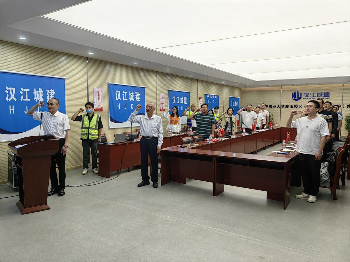 為進(jìn)一步學(xué)習(xí)和發(fā)揚(yáng)“鐵軍精神”,不斷加強(qiáng)基層黨組織的凝聚力和戰(zhàn)斗力,打造精品工程和廉潔工程,5月26日下午,漢江城建建安分公司黨支部聯(lián)合東津新區(qū)城鄉(xiāng)建設(shè)局、智投公司、中韜華勝監(jiān)理公司、漢江城建第二分公司四個(gè)支部在華中農(nóng)業(yè)大學(xué)襄陽校區(qū)(現(xiàn)代農(nóng)業(yè)研究院)建設(shè)項(xiàng)目部共同舉辦“黨建進(jìn)工地 強(qiáng)化責(zé)任擔(dān)當(dāng)”主題黨日活動(dòng),共50余人參會(huì)。