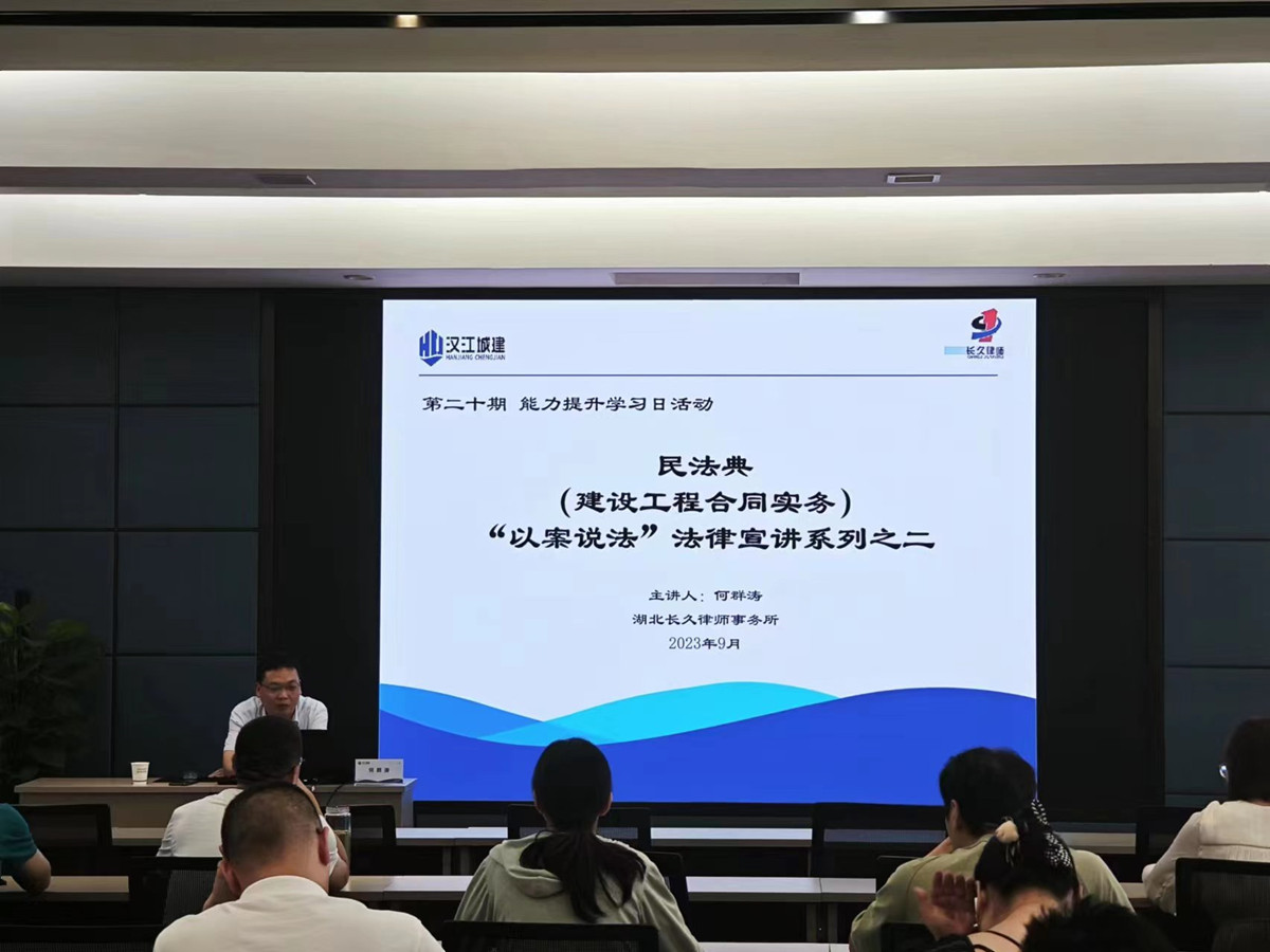 為進(jìn)一步提升員工法律風(fēng)險防范意識,加強(qiáng)公司經(jīng)營合規(guī)管理水平,9月15日下午,漢江城建集團(tuán)有限公司在集團(tuán)603會議室開展“以案說法”建設(shè)工程合同實務(wù)為主題的第二十期能力提升學(xué)習(xí)日法律宣講活動,機(jī)關(guān)各部室、各分(子)公司共30余人參加培訓(xùn)。