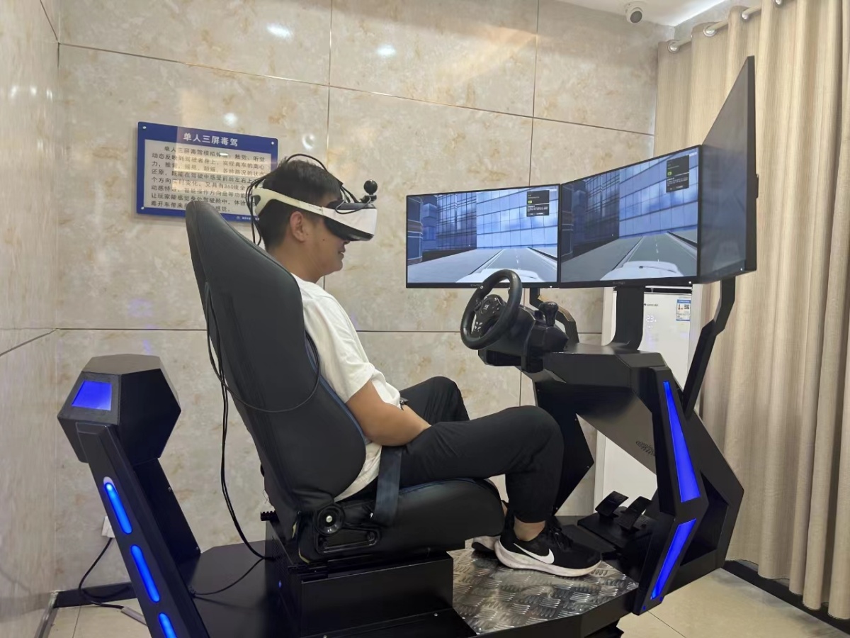在VR體驗(yàn)區(qū),職工代表通過佩戴VR眼鏡在三屏毒駕模擬器上體驗(yàn)了吸毒后出現(xiàn)的幻覺、幻視、眩暈、空間定向障礙等錯(cuò)覺,身臨其境感受毒駕對(duì)自己及對(duì)他人以及社會(huì)產(chǎn)生的巨大危害。
